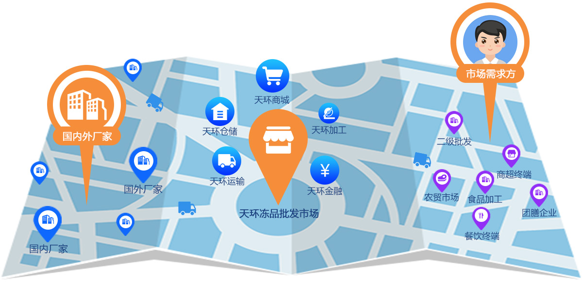 天環(huán)供應(yīng)鏈管理有限公司依托于天環(huán)冷鏈業(yè)已建成凍品食品批發(fā)市場,在傳統(tǒng)的凍品食品批發(fā)市場基礎(chǔ)上,利用互聯(lián)網(wǎng)、物聯(lián)網(wǎng)等信息技術(shù)手段,通過對市場中的商流、物流、信息流及資金流等供應(yīng)鏈要素的流程再造,形成線上線下融合的冷凍品食材交易平臺,覆蓋餐飲終端、商超、食材加工等食材流通渠道的物流配送平臺,以及滿足供應(yīng)鏈上下游各方便捷融資的資金平臺。
